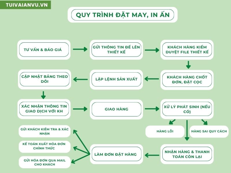Để đảm bảo quá trình đặt hàng diễn ra nhanh chóng và thuận tiện, An Vũ thiết kế quy trình đặt may và in ấn rõ ràng gồm 6 bước cơ bản sau: