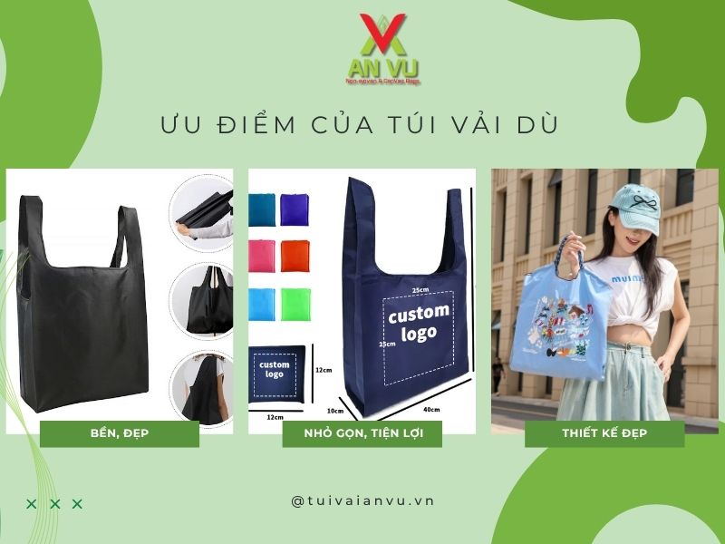 Túi vải dù là dòng sản phẩm được làm từ vải tổng hợp (chủ yếu là polyester hoặc nylon) có khả năng chống thấm, nhẹ và bền bỉ. Loại túi này đang dần thay thế túi nilon trong cuộc sống hiện đại vì vừa thời trang vừa thân thiện môi trường.
