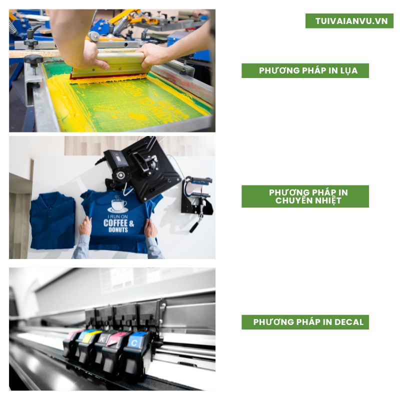 - In lụa: phù hợp logo đơn sắc, số lượng lớn. - In chuyển nhiệt: cho hình ảnh rõ nét, nhiều màu. - Ép decal: bám màu tốt, bề mặt bóng đẹp. |